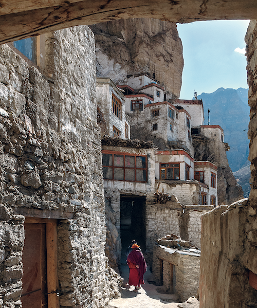 … from the Kashmir valley onwards to Kargil the Muslim population continues but nothing much is left of any great vernacular styleFrom the Kashmir valley onwards to Kargil the Muslim population continues but nothing much is left of any great vernacular style. The moment one enters Ladakh or branches off to Zanskar a totally different style emerges, that of the typical Buddhist dwelling, which continues to Spiti in Himachal Pradesh. A day’s drive from Kargil takes you to Padam, the headquarters of Zanskar region. Padam is situated in a vast amphitheatre of mountains with monasteries perched on some of them. Another day’s trek from Padam is the historical Phugtal monastery, very picturesquely built inside a huge cave in a mountain with the houses of the monks all around it on a steep incline.