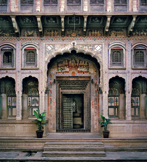 … It is obvious that during this region’s heyday the residents embarked on a competitive fresco painting spree and not a square inch is left bare on the exterior of some houses. The themes include the familiar legends and epics – Dhola Maru, Krishna legend, Mahabharata, Ramayana – interspersed with cars, trains, airplanes, ships, brass bands, Ganeshji, Lakshmi (the goddess of wealth), floral and geometric patterns.On the edge of the Rajasthan desert, in the Marwar region, is the area of Shekhawati with its painted havelis. The Shekawati havelis – courtyard houses – are made of stone and rubble, built with lime, stucco work and ornamental frescoes and paintings. Shekhawati is named after Rao Shekhawat, a cousin of the Jaipur Kachhwaha rulers, who declared independence from them in 1471. Shekhawati comprises of the present districts of Sikar, Jhunjhunu and parts of Churu, the more important towns being Ramgarh, Fatehpur, Lachhmangarh, Jhunjhunu, Chirava, Churu, Mahansar, Mandawa, Nawalgarh, Surajgarh and Malsisar. The main residences are of Rajputs of the area and rich merchants, who are now some of the biggest business houses of the country, their houses here now unoccupied.