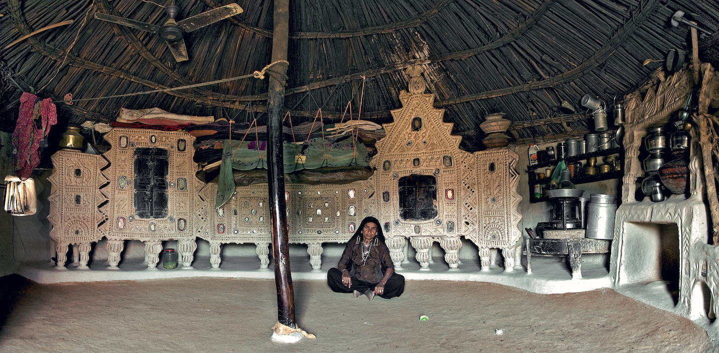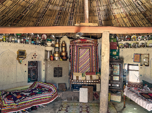 … Lippankaam, mud decorative work with small mirrors embellishes the inside of these hut. The interior also has clay cupboards with wooden shutters for storing food grains