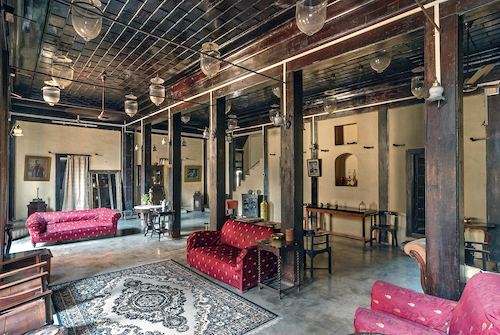 … it is interesting that some wada homes were built as small pleasure palaces, having symmetrically laid out garden plans and fountains, with Persian wheels for filling the overhead tanks, like the magnificent one at WaiIn some wadas, the inside plaster walls facing the court are adorned with monochromatic frescoes in earthen colours of deep red or ochre. The themes of these paintings are illustrations from epics and legends. This colouring technique is known as abashi and the painters belong to the Jingar community. Functional niches with stucco work are built into room walls in clusters and glass paintings adorn the sitting areas. Considering that the Peshwas are Brahmins, it is interesting that some wada homes were built as small pleasure palaces, having symmetrically laid out garden plans and fountains, with Persian wheels for filling the overhead tanks, like the magnificent one at Wai.