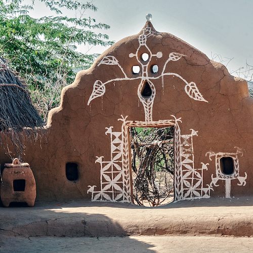 The tribal areas of Gujarat have huts that use the broad teak leaves over straw thatch. Woven split bamboo walls with a coating of mud are made by artisan classes who even today weave baskets, or by the tribals themselves. The mud surface is finished with a coat of dung. Tiles were made locally by potters but are now being replaced by factory made tiles. The huts of the Rathwa tribals are adorned with colourful pithora wall paintings while those of the Warli tribes have drawings in a geometrical manner made with rice paste 🟥