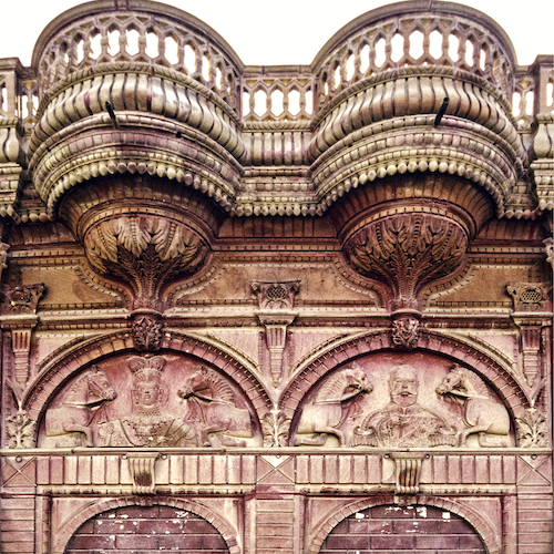 Nathmalji’s haveli was completed in 1885 and the brothers Hathi and Lallu are credited with its construction. The plan is completely different from the Patua havelis and at one time it was a unified structure, now occupied by many tenants. A pair of stone elephants and sentries outside indicate that a court minister lived here. The structure has five stories with a central and rear courtyard. The most fascinating ornamentation on its façade is a finely carved procession in stone that appears to be traveling over its eaves. The figures are small – soldiers, citizenry, caparisoned horses and elephants – and a casual visitor is likely to miss them at first. Carved windows flank the entrance, which has two cupolas in the front.